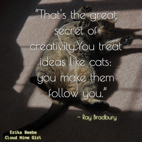 12. I like the cat bit because if I chase my cat for a moment (she likes to play even at age 13), when I turn around, she chases me back. Sometimes, I think ideas are like that. Sometimes, I need to chase them, or wander with my eyes open for them, and sometimes, I think I need to turn and run away for a moment, for the ideas to come catch me.
